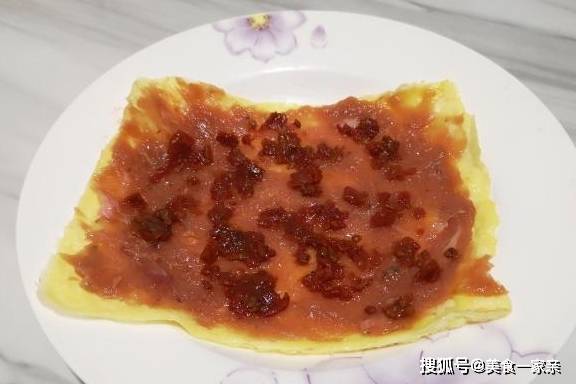5、等鸡蛋液完全煎凝固后,取出蛋皮稍稍晾凉,再把搅拌好的肉泥平铺在蛋皮上,再用勺子涂抹均匀。
