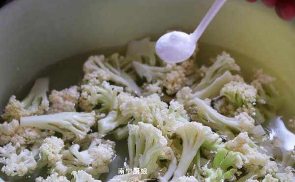 1、我们都知道花椰菜的构造比较紧密,所以在生长过程中是很容易藏污纳垢和小虫子的,所以我们要把花椰菜掰成小瓣后放在洗菜盆中,倒入没过花椰菜的纯净水(家里有净水器的就用纯净水,没有净水器用自来水也可以),然后再放入一勺淀粉或者面粉搅拌溶解,浸泡10分钟,好让淀粉把污垢和小虫子给吸附出来,然后再用纯净水冲洗2遍沥干水分待用。