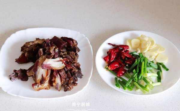 2、因为我用的是我们老家的烟熏腊肉,所以我得先用60度的热水来把腊肉清洗一下,把腊肉表面的烟灰给清洗掉,然后再用厨房纸吸干水分后切成块装盘,如果大家买的是超市卖的腊肉,用纯净水或者温水清洗一次就可以了。再把大蒜去皮后切片,香葱洗净后切段,干辣椒洗净沥干水分装盘待用。