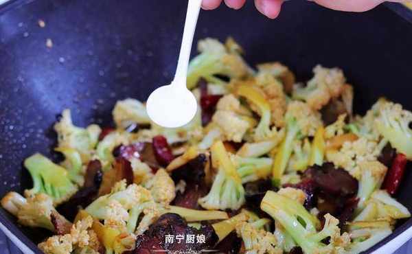 5、倒入一勺生抽、再放入一小勺食盐调味,大火翻炒半分钟。(因为腊肉本身就是咸的,所以不用放太多盐,这里的生抽和少量食盐主要是给花椰菜入味的作用)