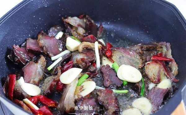 3、因为腊肉本身就富含丰富的油脂,所以我们开火后,起锅,把腊肉块倒入平底不粘锅中后,不用加入食用油,用小火慢慢把腊肉中的油脂给煸炒出来,这样腊肉吃起来不会太油腻,煸炒出的油再拿来继续炒菜会非常的香。腊肉煸炒出油脂后,我们倒入葱蒜、干辣椒一起大火翻炒半分钟,炒出葱蒜的香味。