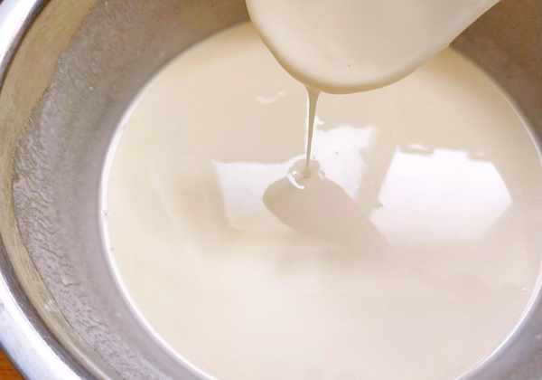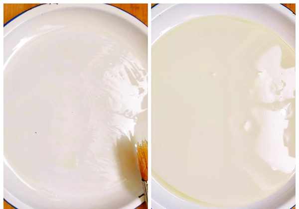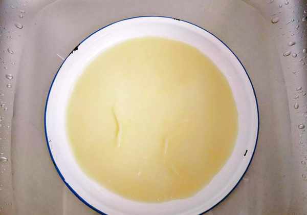 7,我没有整盘,用的平底盆盖,就称之为盘吧!盘子里面均匀刷上油(防止凉皮粘盘底),舀一勺面糊(电饭锅盛粥的勺),倒入盘里,晃动或抖动盘子,使面糊均匀铺满盘底即可。