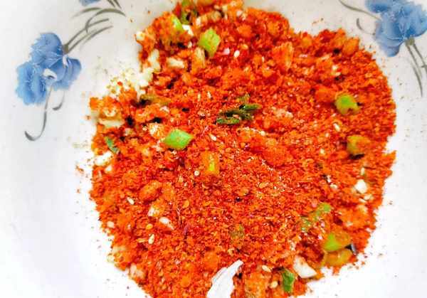 4,碗中倒入适量的干辣椒面,两瓣蒜去皮切碎,少许去皮生姜切碎,少许洗净的小葱切碎,一起放入干辣椒面碗中,加入适量的十三香、盐搅拌均匀。