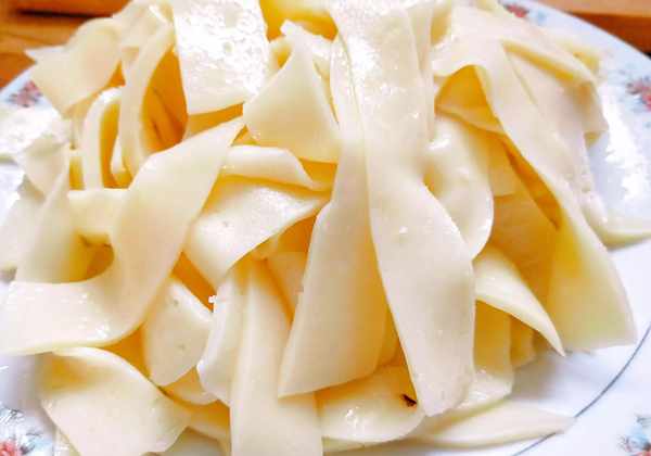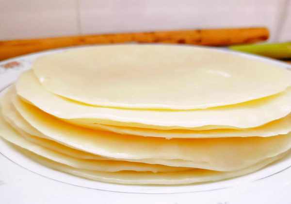 11,把凉皮从盘子里取出,放入另一个盘子,每张凉皮上面刷些熟的食用油,这样摞起来就不会粘了。