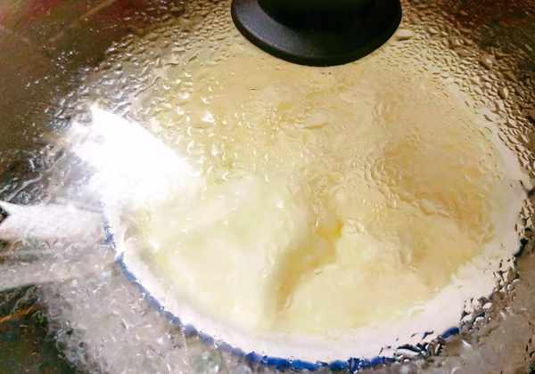 9,盖住锅盖,蒸到隔着锅盖看到鼓起大泡即可,一张不到一分钟,估计几十秒。