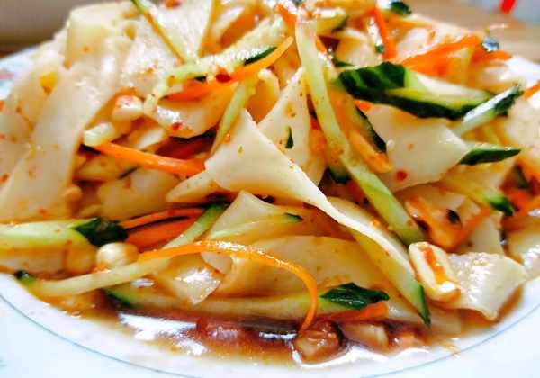 14,盆中放入适量的凉皮和黄瓜丝、胡萝卜丝、花生米,再倒入适量的蒜姜水和适量的辣椒汁,拌匀即可食用。
