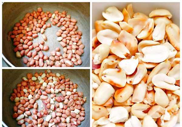 6,锅中放入少许花生米,小火不停翻炒,炒熟后,把表皮搓掉,用菜刀背压一下,装碗备用。