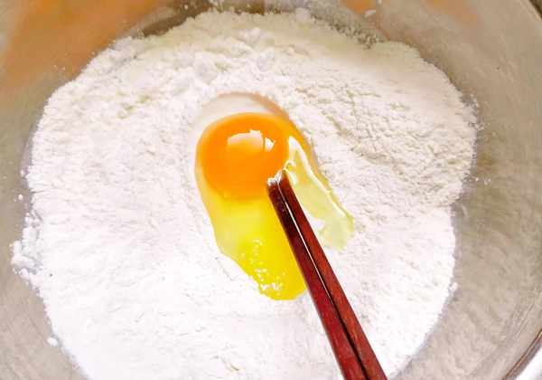 1,适量的面粉和适量的豌豆淀粉,比例1:1,加入适量的盐,搅拌均匀,再打入一个鸡蛋。