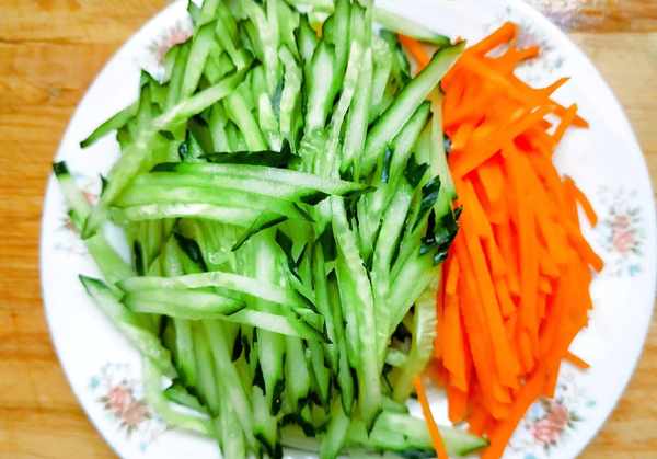 12,一根黄瓜洗净去头尾切成丝,适量洗净的胡萝卜切丝。