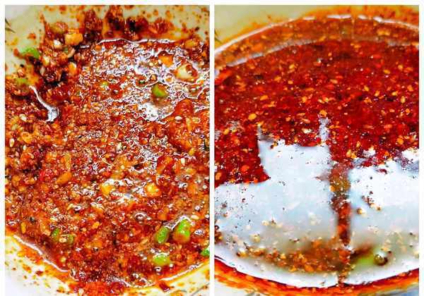 起锅烧油,油热后,倒入装有干辣椒面的碗中,用筷子搅拌均匀,再倒入两勺味极鲜和四勺醋,搅拌均匀即可,不喜欢吃醋的可以不放或少放。