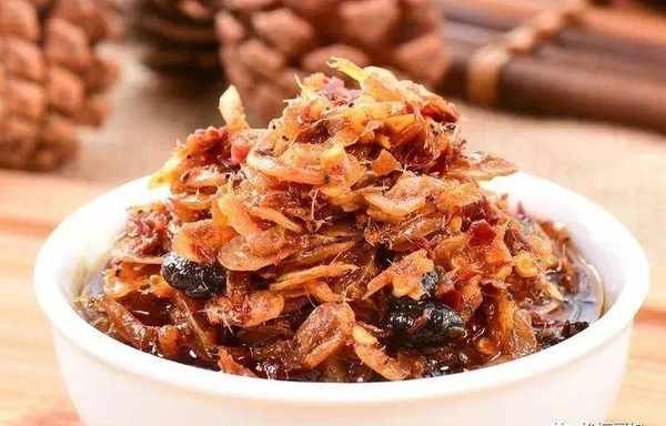 碗中放满虾皮(不要高出碗的边缘),在虾皮上面均匀撒入小半勺白砂糖,再撒上切碎的豆豉,最后依据个人口味撒上一层辣椒碎。
