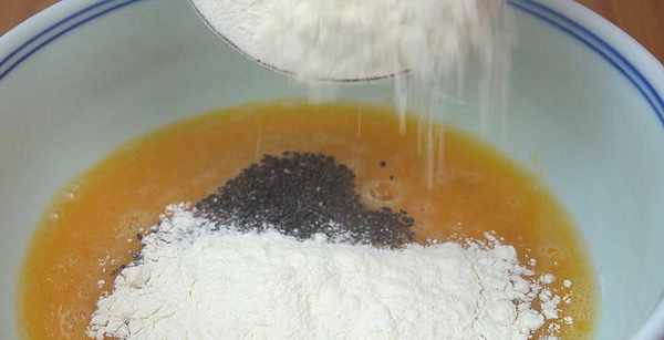 2.接着往里面加入一把黑芝麻,再少量多次地加入干面粉,一边倒一边搅拌。