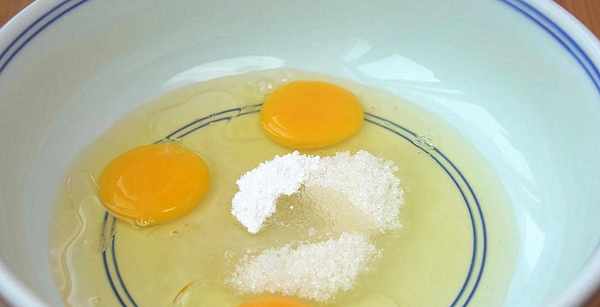 1.准备一个大盆,往里面磕入3个鸡蛋,加入20克白糖,然后加15毫升玉米油,再加2克泡打粉增加蓬松度,先用筷子把它们搅打均匀。食用油最好用没有味道的油,比如大豆油、色拉油都可以用。黄油也可以,吃着奶香味十足。