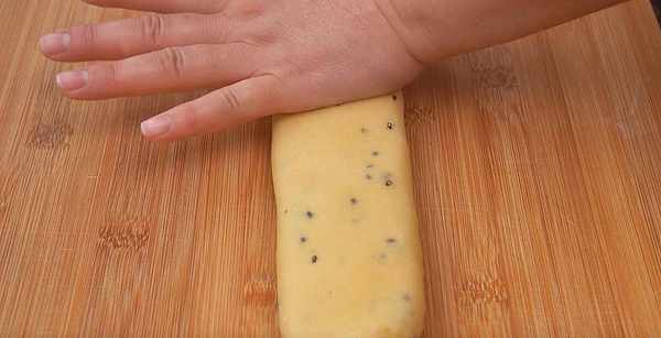 5.接着把它移到案板上,把它搓成长条,然后再用掌心按扁。厚度在1.5厘米左右就可以了。