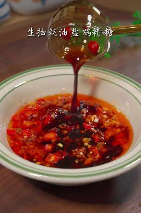 这个时候我们拿出来一个大碗,里面放蒜末、小米辣、郫县豆瓣酱,用大勺,烧一勺热油,浇在上面