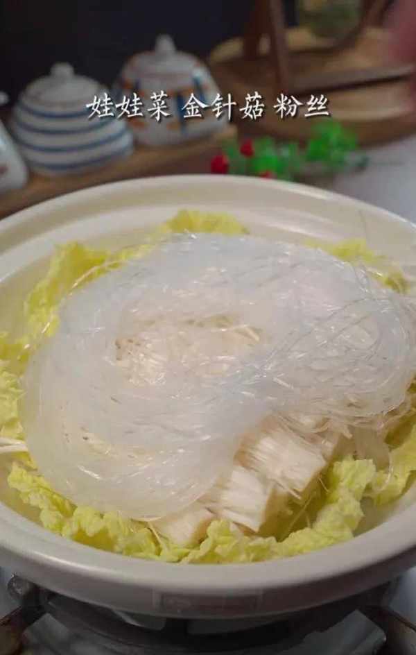 首先我们去菜市场花2毛钱买一颗娃娃菜、一把粉丝、一把金针菇,回到家里把粉丝放到大碗里用温水把它泡开,金针菇用清水冲洗干净,切掉根部,然后用我们发财的小手给它撕成小段,娃娃菜给它一片一片的掰开,然后拿来一个大碗,倒入温水加一大勺盐,把盐化开,把掰好的娃娃菜放到里面浸泡10分钟,再用清水洗干净,拿过来一个砂锅(砂锅超市都有,用砂锅做出来娃娃菜的才好吃),先放入洗好的娃娃菜、再放金针菇、最后放入粉丝
