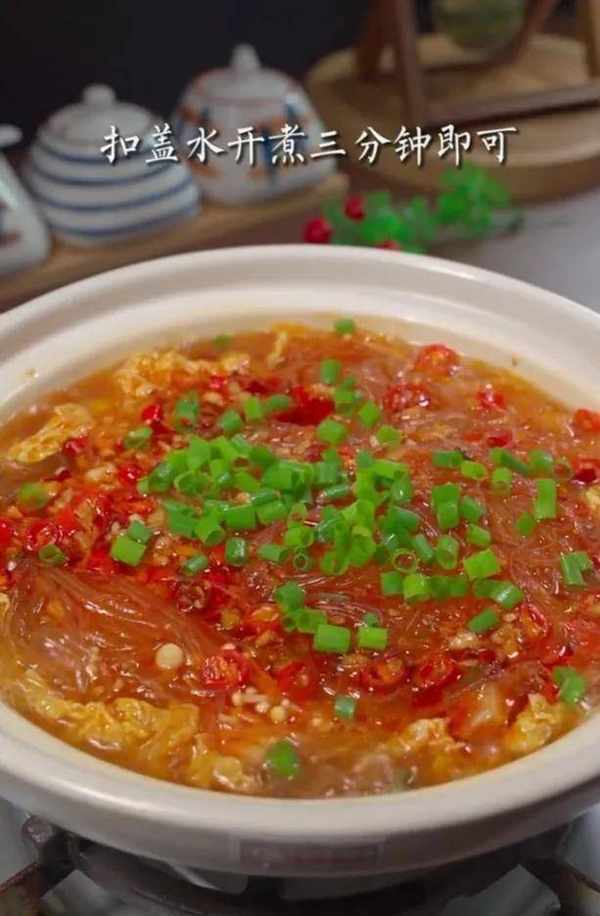 加入适量的水,盖上盖子水开煮三分钟即可,最后大火收汁撒上我们的小葱花