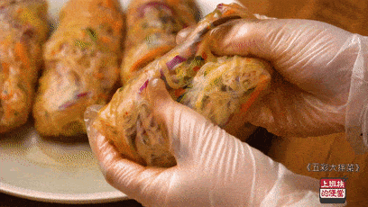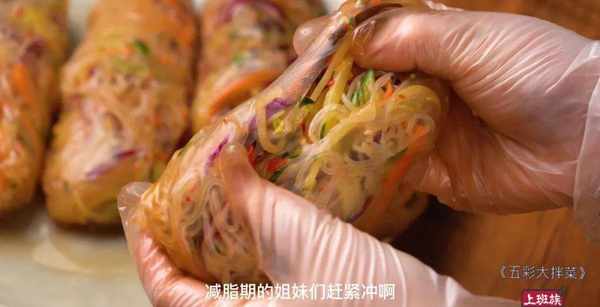 沾了水的泰式春卷皮放上一把拌菜,然后给包起来,这样就成了凉皮卷~