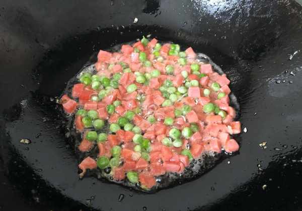(6)重新起锅倒油,把香肠丁,豌豆放进来,翻炒至断生,加蚝油,生抽调味