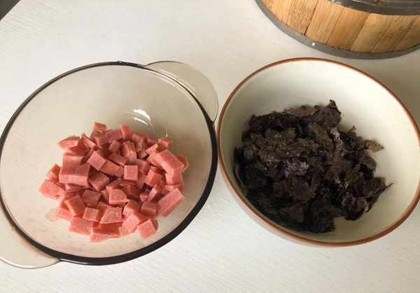 (2)火腿肠改刀切成小丁,紫菜加水清洗干净备用
