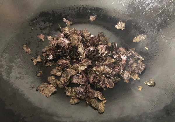 (5)起锅不用倒油,放入洗好的紫菜翻炒,开小火炒至变干变脆,盛出来