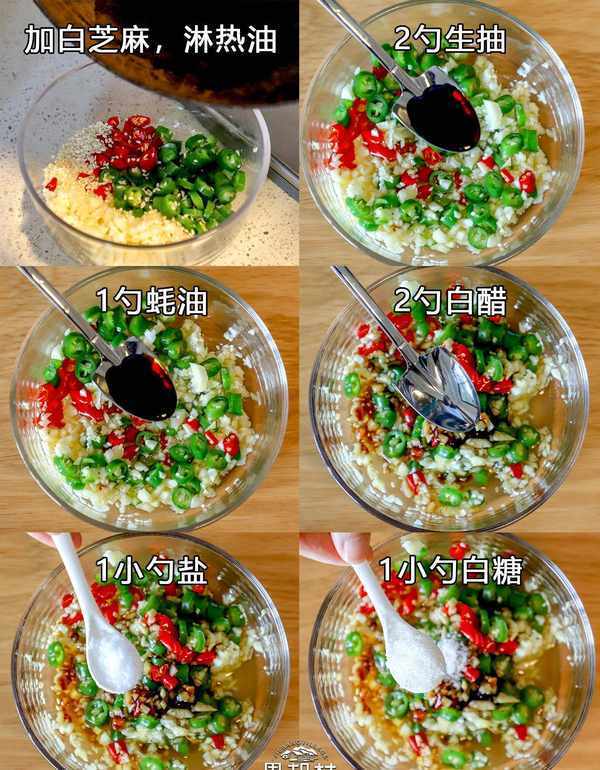 2、开火热油,将热油淋在调料碗里;然后加2勺生抽、1勺蚝油、2勺白醋、1小勺盐、1小勺白糖,搅拌均匀待用。