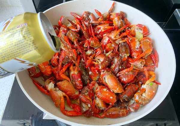 10、倒入一罐啤酒,没过小龙虾,如果不够也可以加点清水,啤酒便宜的就行,不要用黑啤。