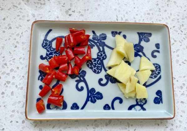 7、把小米辣切成小段,生姜切成小片,装盘备用。