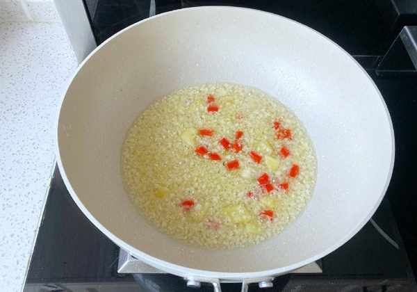 8、炒锅倒入比炒菜多点的植物油,烧热后放入3/4蒜粒(留1/4最后用)、姜片、小米辣,中火炒出香味。