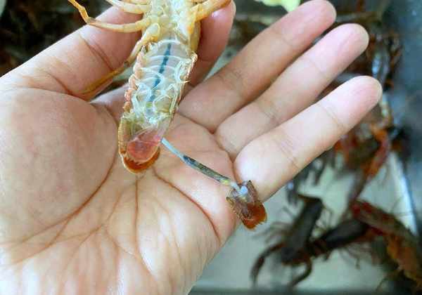 2、抓住小龙虾的腹足由上往下往外拉,把小龙虾的腮拔起去掉。