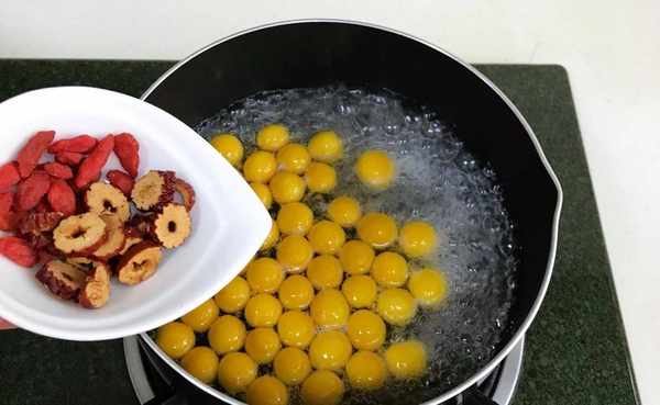 8、随后在锅中加入红枣片和枸杞子,然后把现成的酒酿也倒进锅中。