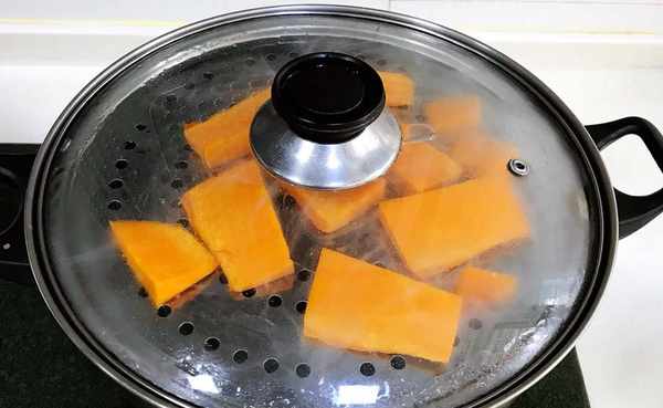 2、将南瓜去皮去籽,然后再把南瓜切成薄片,放进蒸锅中大火蒸15分钟左右即可,南瓜易熟,不必蒸太久。
