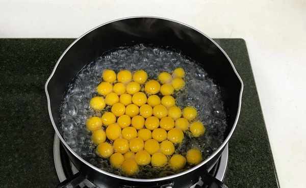 7、在锅中加入适量的清水,大火烧开后把做好的南瓜小圆子放入锅中煮至全部漂浮起来即可。