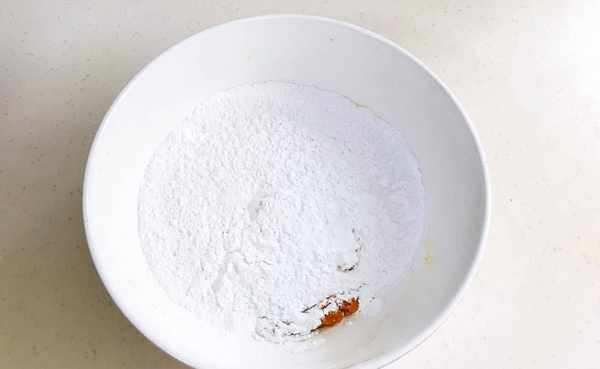 4、趁着南瓜的温度还没降下来,直接将100g的糯米粉倒进捣好的南瓜泥中,全程不要放一滴水,因为南瓜自带水分,就可以将面融合的很好了。