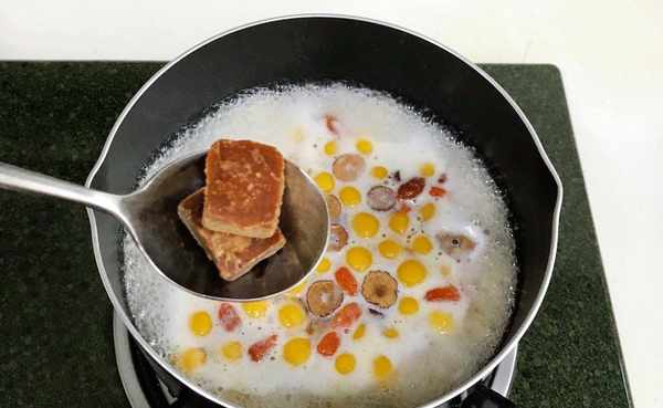 9、继续加入两块红糖和少许淀粉水,再次搅拌均匀后就能出锅享用啦,口感香香甜甜,南瓜小圆子特别Q弹,喜欢吃热的就出锅即食,夏天还可以放进冰箱冷藏一会再食用,口感都超级棒,大家可以试试哦。