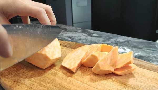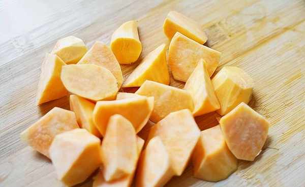 2、趁着煮粥的时候,将红薯洗净削皮后切成块状。
