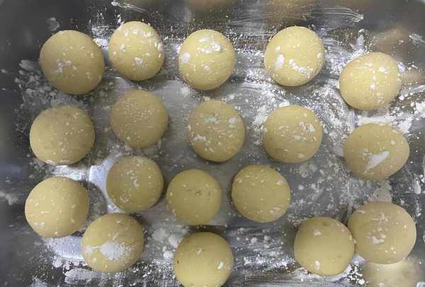 3、锅中加油,等到油热之后,揪小块面团,搓成一个又一个的小圆球,放入油锅中,进行油炸。