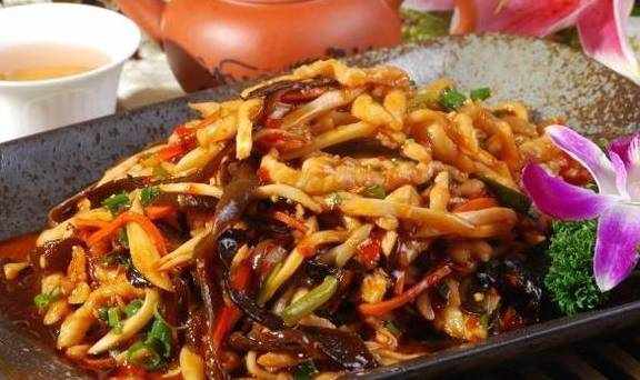 6.倒入青椒和木耳,用装调味汁的小碗装点厨宝高水加进去,翻炒至酱汁浓稠并均匀裹在肉丝和配料上即可。