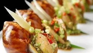 3、把小米辣粒和芹菜粒纳盆,加入少许蚝油、藤椒油、鲜椒油和辣鲜露搅匀后,下煨好的蜗牛肉拌匀,然后再逐一塞回蜗牛壳内,并插上姜片做点缀,最后放盘里摆好,即成。