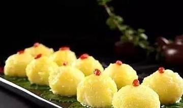 2、锅里掺鲜汤烧开,加入盐、味精和金瓜汁先搅匀,用湿生粉勾成二流芡后,再出锅分别舀在萝卜丸子上面,最后点缀少许的鱼子便好。