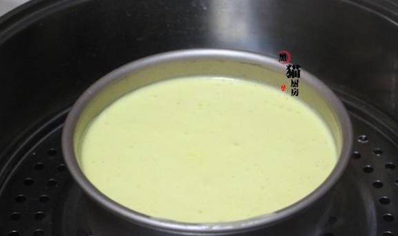 9.蒸锅水烧开,把面糊倒入一个模具内,我这用的是8寸的戚风模具,如果家里有大一些的容器同样可取,水烧开放入后,盖上盖子,中火蒸25分钟。