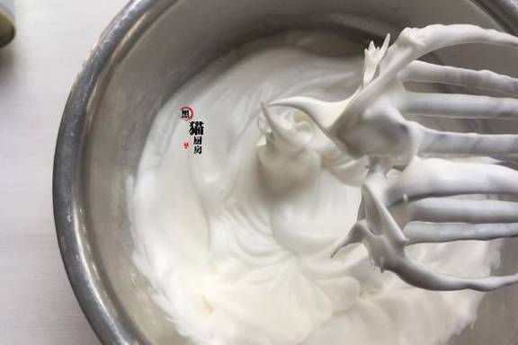 5.分离出来的蛋白,用电动打蛋器,分3次把30克白砂糖加入蛋白中,并把蛋白打发至下图示,提起打蛋器蛋白状态成弯钩状,这样蛋白就打发好了。打发蛋白的时候可以适当加几滴柠檬汁,能使蛋白打发成型更快速和稳定哟。