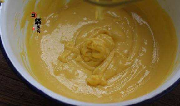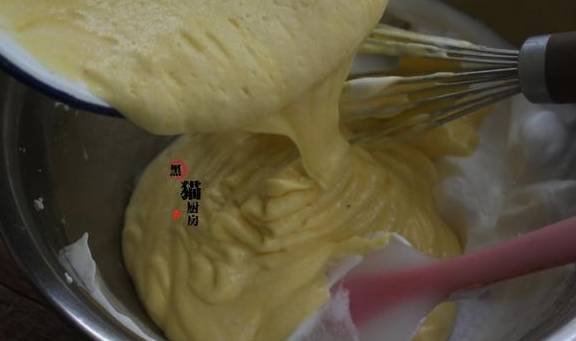翻拌蛋黄糊和蛋白的速度要快,时间太久容易使蛋白消泡。