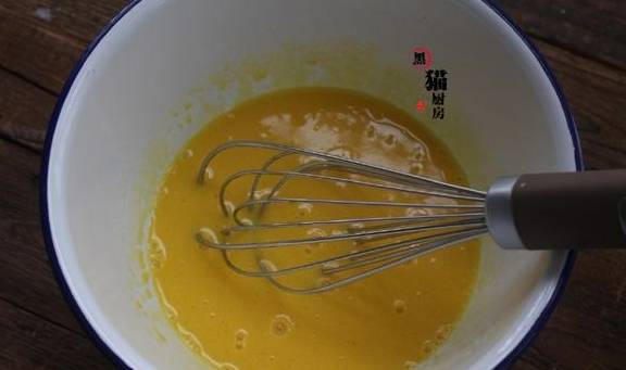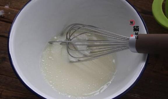 做法:1.首先做这个小米糕得用电子称量好材料,所有材料都放进无水无油的容器里,清水、炼奶和玉米油这三样先放入一个大碗里,用蛋抽把它们搅拌均匀乳化了,也就是油水经过快速搅拌后没有出现分离状态,液体呈奶白色。