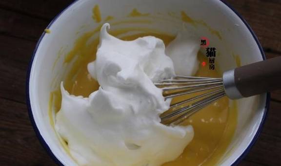 6.打发好的蛋白盛1/3,倒入蛋黄面糊里,用蛋抽拌匀。拌匀后再倒入1/3的蛋白,与蛋糊再次拌匀。