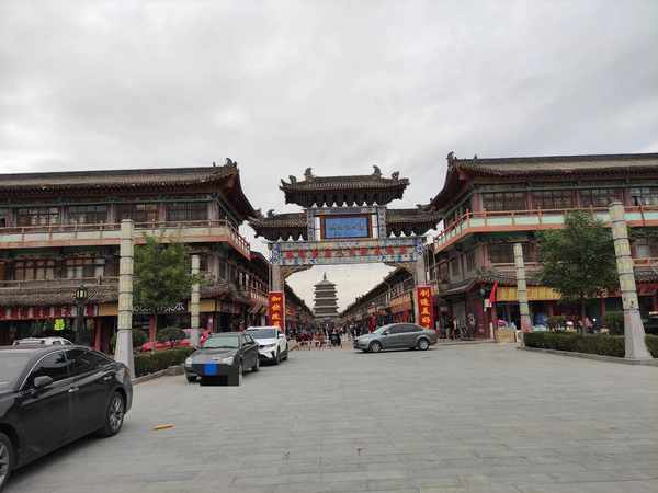 我在应县木塔的十字路口下车。我去应县的目的很明确。这是直接去应县木塔。在前往应县木塔的路上,首先映入眼帘的是一座名为“辽代文化城”的大门。通过大门,你可以从远处看到木塔的雄伟。走过这段面对木塔的仿古街道后,我感觉木塔越来越近,心情越来越激动。最后,我想见见我着迷已久的应县木塔。