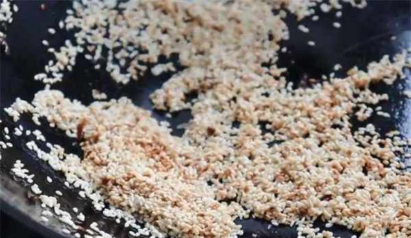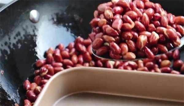 4、锅中倒入少量油。油微热时,加入花生米炒至熟。花生米煮熟后捞出研磨备用。