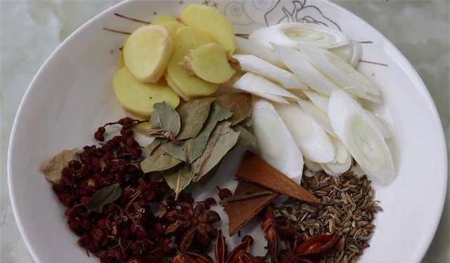 7、准备好的香料有胡椒粉、八角、小茴香、桂皮、洋葱、月桂叶和姜片。
