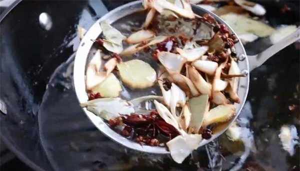 8、锅中倒入少许油。当油50%热时,倒入这些香料,小火慢炒10分钟,将这些材料炒至干黄。待里面的香味完全炸透后,就可以捞出来了。来了。