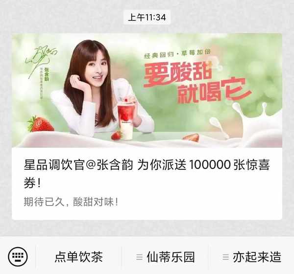 而同一时间打开外卖,消费者会发现书亦的外卖门店,头像、皮肤、Banner都整齐地换成张含韵代言视觉,还有优惠券派发,进一步提升转化率。